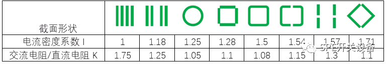 另外在大電流的情況下,矩形母線需要采用多片導(dǎo)體,引起的附加損耗、集膚效應(yīng)系數(shù)大,電流分布不均勻,載流能力下降很大,在相同截面積的情況下,不同截面形狀的導(dǎo)體受集膚效應(yīng)影響的情況如下,可以看出圓管比矩形銅排更加具有優(yōu)異的導(dǎo)電能力。