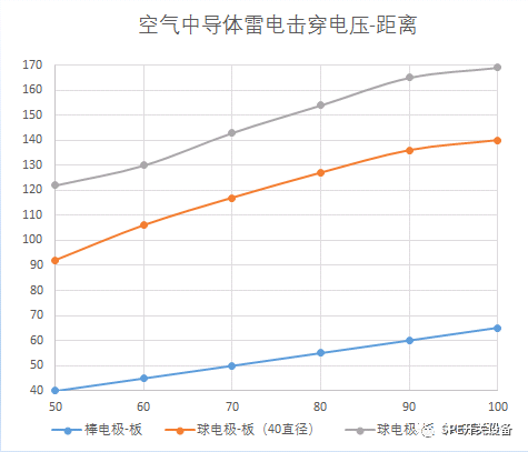 對于40.5kV 中壓柜,由于電壓高,絕緣水平要求高,因此母排的選擇更應(yīng)該考慮開關(guān)柜整體絕緣要求,因此優(yōu)先選擇管型銅排。下圖是空氣中,不同形狀電極對板之間距離與雷電沖擊電壓之間的關(guān)系,棒電極相當(dāng)于矩形銅排的厚邊,40mm直徑球體相當(dāng)于圓管,可以看出在相同的距離下,圓管的耐雷電沖擊水平高得多,而直徑越大,越接近均勻電場,因此耐壓水平越高,圓銅管排更加適合作為40.5KV開關(guān)柜的母線。